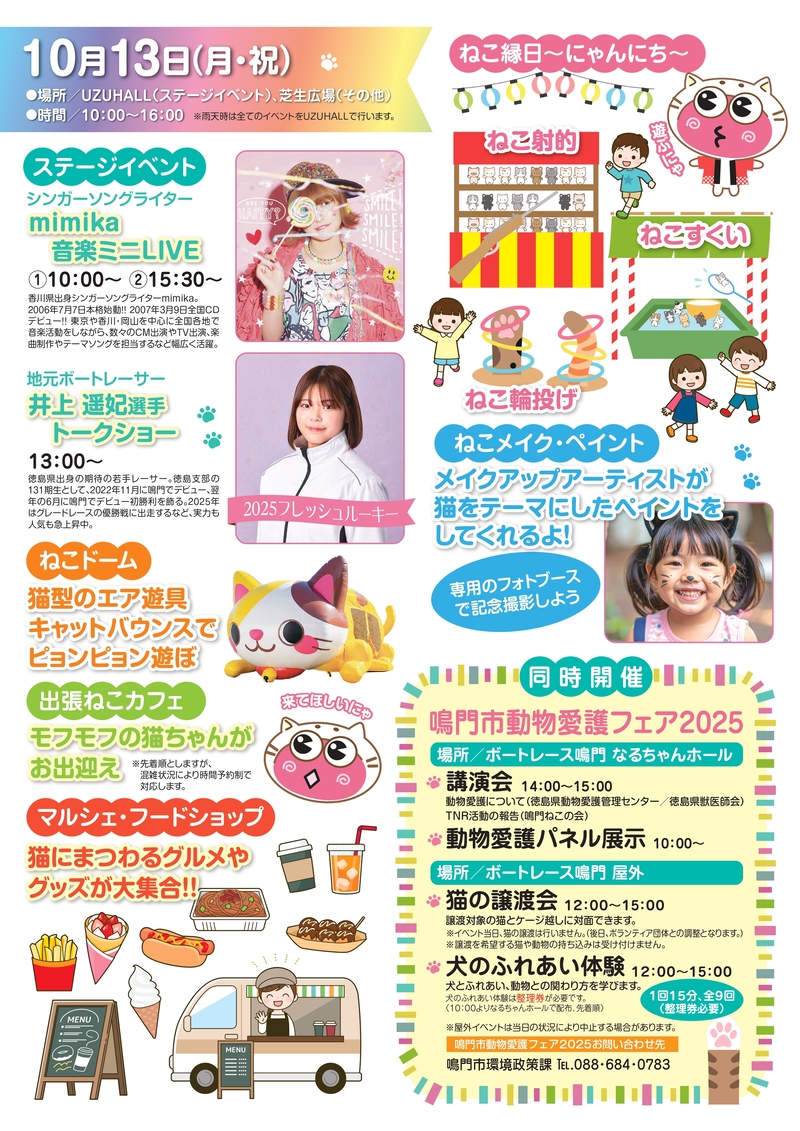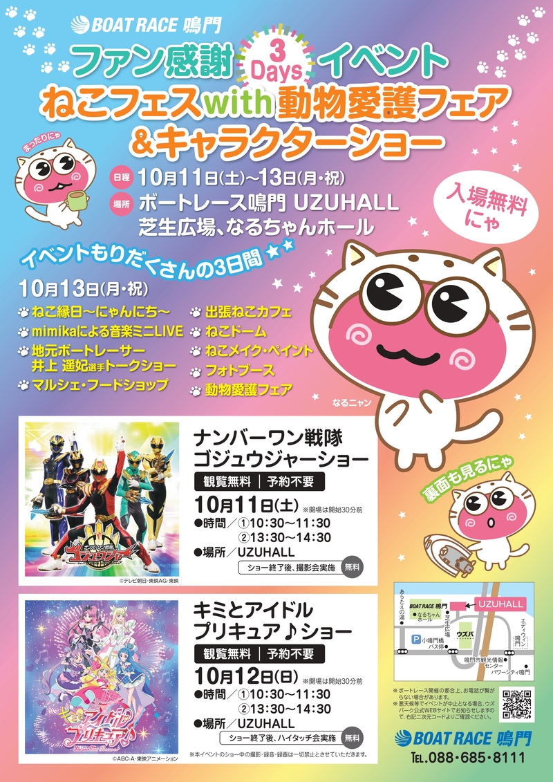 10月の3連休、ボートレース鳴門ではイベントが盛りだくさん!子どもに人気のキャラクターショー、ねこフェスなどを開催します。