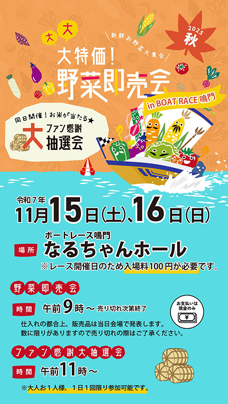 「2025秋 大大大特価!野菜即売会in BOAT RACE鳴門」を開催します。