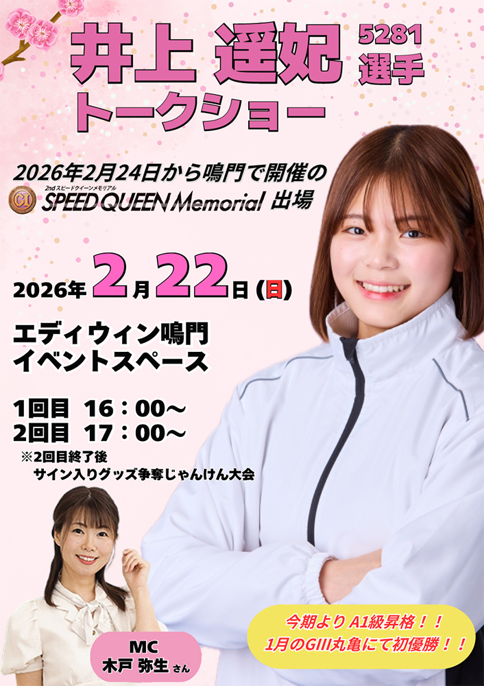 PGI第2回スピードクイーンメモリアル開催直前に、外向発売所エディウィン鳴門では、徳島支部の井上遥妃選手トークショーを下記のとおり開催します!